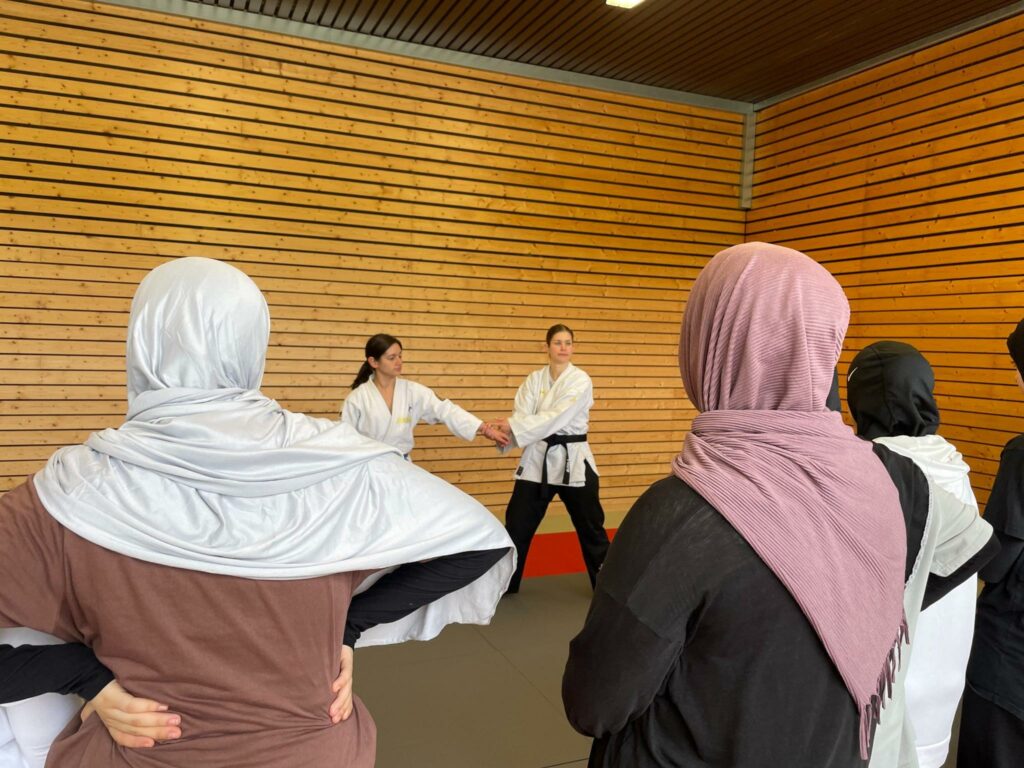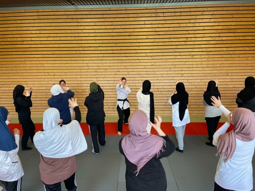 Am Samstag, den 13. Mai 2023, stand bei uns im Dojo alles unter dem Motto: Frauenpower. Etwa 20 jugendliche Mädels mit muslimischem Hintergrund nahmen an einem unserer Selbstverteidigungskurse teil. Gemeinsam besprachen wir, wie Frauen im alltäglichen Leben Gewalt begegnen kann und wie man sich dagegen wehrt – mit der Stimme, der eigenen Körperhaltung und kleinen Jiu-Tricks.